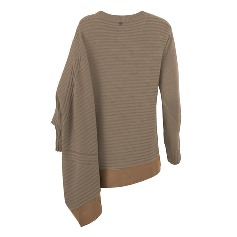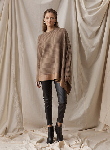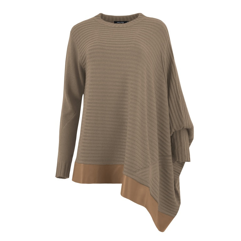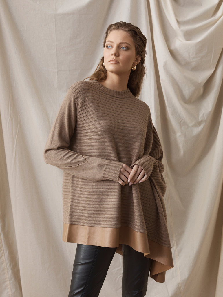 The Newcastle has multiple detailed knitting textures throughout, in a mid-weight finish, with a slightly wider crew-neck line that allows the garment to be worn on its own or over a shirt. The soft supple Australian Merino wool blend yarn is spliced with a wide raw-edge leather hem and an asymmetrically cut to drape perfectly over any outfit.